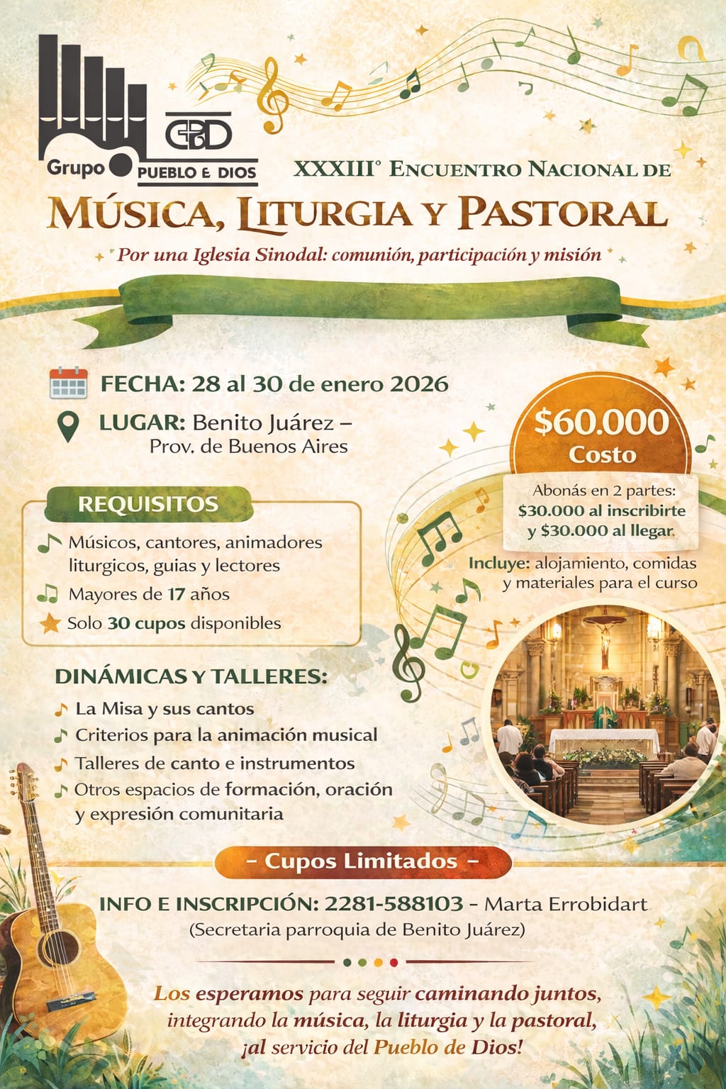 El Grupo Pueblo de Dios, como servicio a las comunidades, ha invitado a participar de sus Encuentros Regionales de Música Liturgia y Pastoral que se llevan a cabo en diversas ciudades.